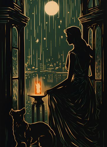 Plakat z serii pejzaże zatytułowany Nocne Szeptanie. Zadziwiająca sylwetka kobiety stojącej na balkonie, skąpana w świetle księżyca, jest podkreślana przez delikatne kontury jej sukni. Obok niej, wierny towarzysz w postaci kota, czuwa nad otoczeniem. Spokojna atmosfera miejskiej nocy na tle zorzy oraz migoczące gwiazdy nadają kompozycji niezwykłego uroku i głębokiej kontemplacji. Świetnie sprawdzi się w cichych kącikach czytelniczych, hotelowych lobby oraz w miejscach dedykowanych relaksowi i medytacji.