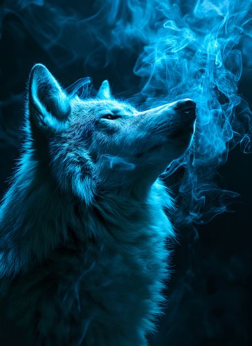 Plakat z serii natura zatytułowany Oddech Wilka przedstawia majestatycznego wilka odsłaniającego głowę ku niebu, otoczonego przez eteryczny, niebieski dym, który wydaje się być przedłużeniem jego oddechu. Sylwetka zwierzęcia jest wyraźna i dynamiczna, a jego futro jest ukazane z niesamowitą szczegółowością, każdy włos wydaje się lśnić w tajemniczym, błękitnym świetle. Dym dodaje kompozycji mistycznego klimatu, a intensywny niebieski kolor sprawia, że całość nabiera głębi i charakteru. Plakat ten doskonale sprawdziłby się jako element dekoracyjny w przestrzeniach inspirowanych naturą, takich jak domowe biblioteki, pokoje relaksu, czy studia jogi, a także jako akcent w nowoczesnych, miejskich loftach dla miłośników dzikiej przyrody i ducha wolności.