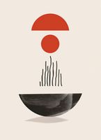 Plakat z serii boho zatytułowany Półokrągła Forma.Na tej grafike zmysłowe, geometryczne kształty tworzą obraz, który równie dobrze może być interpretacją wschodu słońca, jak i abstrakcyjnym przedstawieniem równowagi w przyrodzie. Półokrągła, czerwona forma nad czarną, pionową linią może sugerować słońce wschodzące nad cichym jeziorem, a czerwony krąg pośrodku może być metaforą istoty życia. Duża, ciemna forma na dole to ziemia lub możliwe odbicie, a całość kreuje uczucie pełni i harmonii.Plakat wprowadzi do wnętrza poczucie spokoju i wyważenia. Jest idealny dla tych, którzy chcą dodać do swojej przestrzeni element medytacyjny, pobudzający do refleksji. Doskonale pasuje do minimalistycznych salonów, biur, a także jako element zen w sypialniach, wprowadzając atmosferę oczyszczenia i wewnętrznej równowagi.