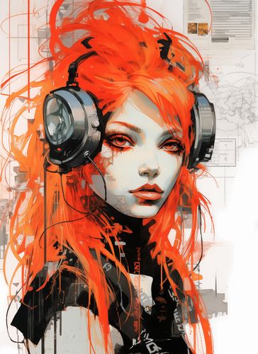 Plakat z serii pop art zatytułowany Rytm Metropolii. Dynamiczna kompozycja łączy portret kobiety o wyrazistych, pomarańczowych włosach z elementami miejskiego krajobrazu. Jej spojrzenie jest intensywne i pełne pasji, zaś duże słuchawki na uszach sugerują miłość do muzyki i rytmu wielkiego miasta. Abstrakcyjne linie i kształty, mieszające się z realistycznie oddaną postacią, tworzą wrażenie ruchu i pulsującej energii. To dzieło sztuki jest idealne dla miłośników muzyki, street artu i nowoczesnego designu, doskonale nadając się do wnętrz loftów, studiów muzycznych czy awangardowych salonów, które pragną podkreślić miejski charakter swojej przestrzeni.