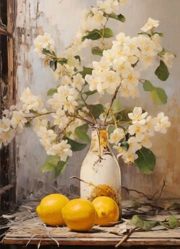 Plakat z serii wnętrza zatytułowany Słodkie Chwile. Delikatne białe kwiaty o subtelnym żółtym środku rozkwitają pełnym blaskiem obok dojrzewających cytryn, które wyróżniają się na tle w delikatnych pastelowych odcieniach. Starannie postarzana butelka i rustykalne drewno dodają nuty nostalgii i spokoju do tej kompozycji. Delikatna gra światła i cienia tworzy głęboką atmosferę i dodaje ciepła do sceny. Świetnie sprawdzi się w kawiarniach o prowansalskim stylu, domowych jadalniach dla tych, którzy pragną dodać do swojej przestrzeni odrobinę wiejskiego uroku, czy też w hotelach, gdzie chce się podkreślić elegancję i ciepło naturalnych elementów.