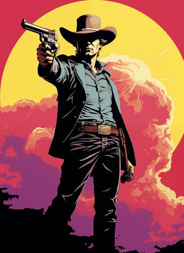 Plakat z serii pop art zatytułowany Strzelec z Epoki. Ten plakat przedstawia postać klasycznego kowboja w akcie wystrzału, z tłem wschodzącego słońca, które rozświetla scenę w ciepłych odcieniach czerwieni i pomarańczy. Silny kontrast i zdecydowane linie wydobywają charakterystyczne cechy postaci, od kapelusza po detale na szelkach i pasie. Plakat ten jest hołdem dla kultury westernów i bezkresnych amerykańskich przestrzeni, idealny dla miłośników historii i kinematografii, a także jako wyrazisty element dekoracyjny w miejscach takich jak domy, bary tematyczne lub sale kinowe.