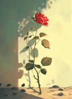Plakat z serii abstrakcja zatytułowany Subtelność przedstawia pojedynczą, kwitnącą różę w subtelnie oświetlonym pomieszczeniu, które wprowadza atmosferę spokoju i refleksji. Delikatne światło przesączające się przez okno rzuca cienie liści na blady, ciepły tło, co nadaje scenie głębi i tekstury. Rozwinięty kwiat róży w pełnym rozkwicie, o intensywnie czerwonym kolorze, jest centralnym punktem kompozycji, symbolizującym zarówno delikatność, jak i siłę życia. Opadające płatki wokół smukłej łodygi tworzą poczucie ulotnego piękna i przemijania. Ten plakat doskonale sprawdzi się jako dekoracja w przestrzeniach promujących spokój i kontemplację, takich jak salony, pokoje relaksacyjne czy studia jogi.