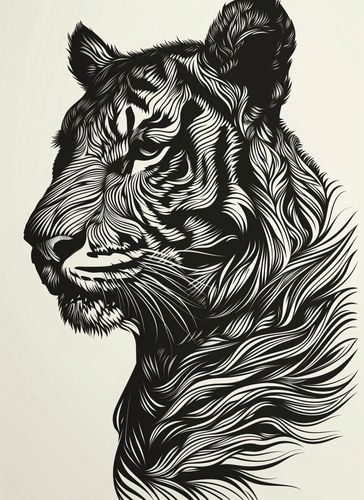 Plakat z serii wnętrza zatytułowany Tygrysi Gwizd. Ta dramatyczna grafika przedstawia tygrysa w stylu linorytu, z wyraźnymi, płynnymi liniami układającymi się w złożony wzór futra. Monochromatyczna paleta, z ciemnymi i jasnymi odcieniami na neutralnym tle, podkreśla majestatyczną postawę i intensywny wzrok tego dzikiego zwierzęcia. Plakat emanuje siłą i elegancją, oddając w pełni królewski charakter tygrysa. Idealny do wnętrz urządzonych w stylu minimalistycznym lub nowoczesnym, będzie także pasował do przestrzeni, które chcą podkreślić motywy przyrodnicze lub eksplorować tematykę ochrony dzikiej przyrody.