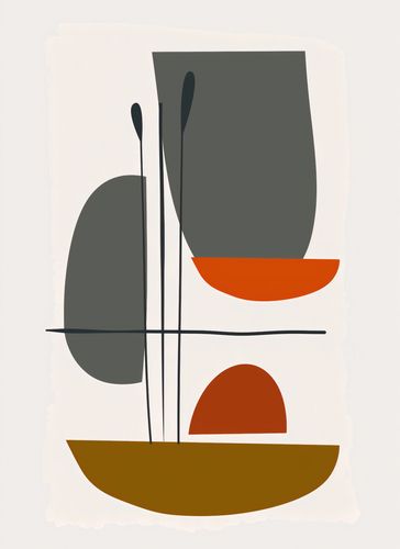 Plakat z serii boho zatytułowany Współgranie to odważne połączenie kształtów i kolorów, gdzie każdy element współgra z innymi, tworząc zbalansowaną całość. Zachowując estetykę mid-century modern, dzieło łączy w sobie ciepłe odcienie brązu, ochry oraz głęboką czerwień z neutralnymi szarościami i czernią. Abstrakcyjne formy przypominające naczynia i rośliny nakładają się na siebie, tworząc iluzję głębi i perspektywy. Delikatne linie nadają kompozycji strukturę i porządek. Ten plakat będzie wyróżniającym się dodatkiem do każdego nowoczesnego wnętrza, idealnie komponując się w przestrzeniach, gdzie dominuje prostota i spokój, jak minimalistyczne salony, stylowe biura czy ciche kąciki do czytania.