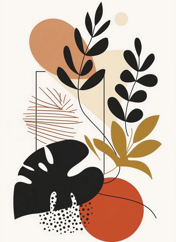 Plakat z serii minimalistyczne zatytułowany Zawisły Liść. Na plakacie dominują płynne linie i organiczne formy roślin kontrastujące z geometrycznymi figurami, tworząc wyjątkową harmonię między naturą a abstrakcją. Kolorystyka w ciepłych odcieniach beżu, pomarańczy, czerni i złota nadaje kompozycji ciepło i elegancję. Przywodzi na myśl połączenie tradycyjnego z nowoczesnym, gdzie elementy przyrody są przedstawione w stylu redukcyjnym. Idealny do wnętrz, które cenią współczesną sztukę z nutą natury, doskonale nadający się do umieszczenia w salonach, holach czy w pokojach z myślą o dodaniu życia i charakteru przestrzeni.
