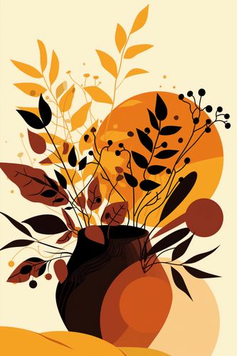 Plakat z serii minimalistyczne zatytułowany Bukiet Owoców. Grafika ta przedstawia estetyczny układ liści i owoców jesieni w klasycznym, ciemnym wazonie, umieszczony na tle ciepłych, okrągłych form w tonacji jesiennej palecie. Gama kolorów rozciąga się od intensywnego mahoń do miękkiego złota, przywołując uczucie ciepła, które towarzyszy złotej porze roku. Przemyślne rozpryski i drobne detale nadają całości dynamiki, sugerując żywotność i obfitość jesiennych plonów. Plakat ten idealnie odnajdzie się w przytulnych wnętrzach, wnosić będzie atmosferę spokoju i refleksji. Idealnie nadaje się do salonów, pokojów dziennych lub przestrzeni, gdzie dominuje naturalna paleta barw i materiałów.