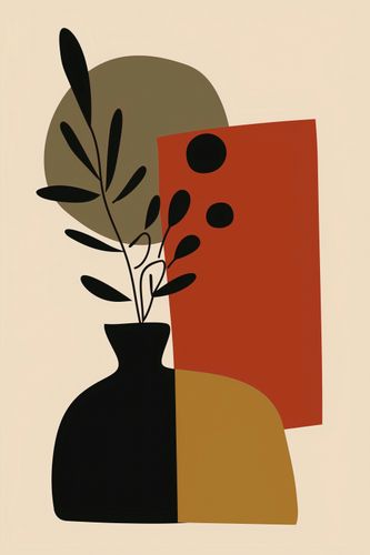 Plakat z serii minimalistyczne zatytułowany Dynamika Kompozycji. Ta grafika to esencja minimalistycznego piękna. Geometryczne formy wplecione w organiczny motyw roślinny tworzą spokojną, ale zarazem dynamiczną kompozycję. Proste linie i zrównoważone zestawienie kolorów – głębokiej czerni, ciepłego terrakoty, stonowanej zieleni i złota – nadają temu dziełu subtelny, ale wyrafinowany charakter. Dzieło idealnie wpisze się w nowoczesne, minimalistyczne lub śródziemnomorskie wnętrza, dostarczając delikatnego akcentu natury i abstrakcji.