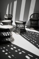 Plakat z serii wnętrza zatytułowany Gra Świateł to stylowa, monochromatyczna fotografia, która oddaje estetykę współczesnego designu. Na fotografii widzimy zestaw eleganckich, plecionych stołków z rattanu ustawionych na tle geometrycznych cieni. Ostre linie cieni przełamują okrągłe kształty mebli, tworząc fascynującą kompozycję pełną kontrastów. Białe siedziska stołków pięknie kontrastują z ciemniejszymi elementami, a gra światła i cienia nadaje scenie trójwymiarowość i teksturę. Plakat ten będzie doskonały dla miłośników minimalistycznych wnętrz, a także dla osób poszukujących elementu dekoracyjnego, który wprowadzi do pomieszczenia nowoczesny i artystyczny akcent. Idealny do nowoczesnych przestrzeni mieszkalnych, biur, kawiarni lub galerii sztuki.