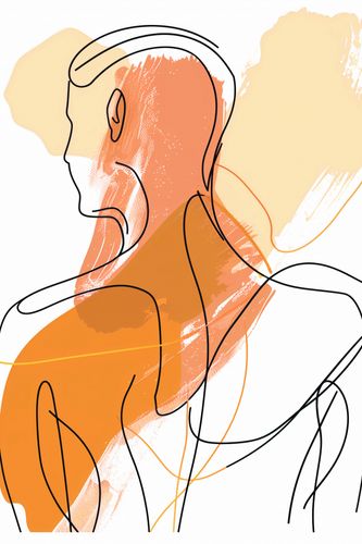 Plakat z serii minimalistyczne zatytułowany Kontur Własności. Grafika przedstawia stylizowaną, abstrakcyjną sylwetkę człowieka, zarysowaną grubymi, fluidalnymi liniami na tle o ciepłych, spokojnych kolorach. Harmonia pomiędzy beżem a pomarańczem tworzy wrażenie spokoju i ciepła, podczas gdy minimalistyczna forma sugeruje skupienie i kontemplację. Całość kompozycji jest zarazem dynamiczna dzięki śmiałym, zakreślonym liniami, jak i uspokajająca przez pastelowe plamy barw. Świetnie sprawdzi się w pomieszczeniach, które mają służyć relaksacji i odpoczynkowi, takich jak sypialnie czy pokoje medytacyjne. Będzie również cennym dodatkiem do przestrzeni wspólnych, takich jak salony lub poczekalnie, gdzie neutralne, ale ciepłe barwy wprowadzą atmosferę wyciszenia i elegancji.