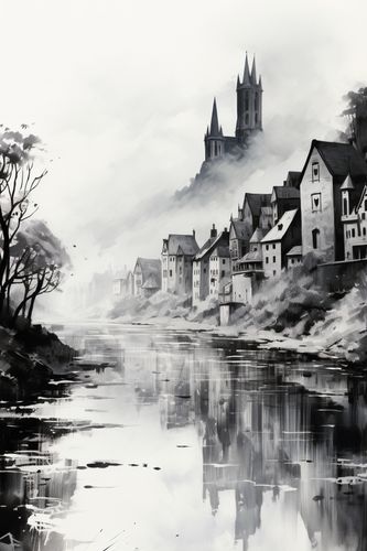 Plakat z serii pejzaże zatytułowany Mglisty Refleks. Misterne pociągnięcia pędzla przedstawiają starą wieś schowaną w mrocznych zakątkach gór, z dominującymi wieżami kościoła wznoszącymi się nad nią. Mgła otulająca krajobraz i odbicie w spokojnej wodzie tworzą atmosferę tajemniczości i zadumy. Monochromatyczna paleta barw dodaje głębi i intensywności całemu obrazowi, czyniąc go idealnym wyborem dla klasycznych salonów oraz miejsc takich jak kawiarnie o historycznym charakterze czy ekskluzywne kluby dyskusyjne.