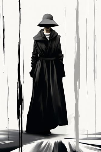 Plakat z serii wnętrza zatytułowany Mroczna Taina. Enigmatyczna postać w czarnym płaszczu i szerokim kapeluszu ukrywa swoją tożsamość, podkreślając aura tajemniczości. Czarno-białe tło z pionowymi smugami przypominającymi deszcz lub płynący atrament dodaje głębi i dramatyzmu kompozycji. Subtelne niuanse światła i cienia grają na powierzchni płaszcza, tworząc atmosferę intrygi i nieokreślonego niebezpieczeństwa. Świetnie sprawdzi się w nowoczesnych galeriach sztuki, luksusowych hotelach o minimalistycznym designie oraz w przestrzeniach przeznaczonych dla miłośników noir i kryminałów.