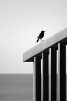 Plakat z serii pejzaże zatytułowany Samotna Odchłań. Ten skrajnie minimalistyczny obraz przedstawia pojedynczego ptaka spoczywającego na czystej, białej krawędzi konstrukcji, z subtelnym tłem nieskończonego morza. Zdjęcie w skali szarości, gdzie tylko kontury ptaka wyróżniają się na jednolitym tle, wywołuje poczucie spokoju i introspekcji. Idealny dla nowoczesnych przestrzeni biurowych i domowych, które pragną oddać hołd prostocie i skupieniu, a także jako przemyślany akcent w galeriach sztuki czy minimalistycznych salonach.