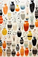 Plakat z serii wnętrza zatytułowany Symfonia Wazonów. Wspaniałe wazony w bogatej palecie kolorów, od głębokiej czerni do ciepłych odcieni pomarańczu, tworzą intrygującą mozaikę wzorów i kształtów. Delikatne motywy roślinne, które zdobią niektóre wazony, dodają uroku i lekkości, a różnorodność wzorów i faktur przyciąga wzrok i zaprasza do głębszej refleksji. Kontrast między jasnymi i ciemnymi barwami, a także subtelne niuanse w każdym wazonie, dodają tej kompozycji głębi i dramatu. Ten artystyczny plakat doskonale wpisuje się w klimat wyrafinowanych galerii sztuki, eleganckich kawiarni oraz nowoczesnych przestrzeni mieszkalnych, które stawiają na unikatowy design.