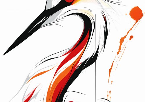 Plakat z serii motywy wschodnie zatytułowany Bocian to dynamiczna i ekspresyjna interpretacja bociana, wykonana w stylu nowoczesnej abstrakcji. Ptak przedstawiony jest za pomocą ostrych, płynnych linii i silnych kontrastów kolorystycznych, gdzie biel, czerń i intensywne odcienie czerwieni przenikają się, tworząc uczucie ruchu i energii. Ogień w oku bociana i płomienne akcenty na jego upierzeniu sugerują pasję i życiową siłę, a spontaniczne plamy i kropki dodają dziełu artystycznego zacięcia. Plakat emanuje siłą i wolnością, idealny do wnętrz, które chcą wyrazić dynamizm i siłę natury, doskonały dla przestrzeni pełnych energii jak nowoczesne biura, kreatywne pracownie, lub jako wyrazisty element dekoracyjny w domowym salonie.
