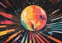 Plakat z serii pop art zatytułowany Disco Gra!. Plakat prezentuje stylizowaną dyskotekową kulę w kształcie globusu, która jest centralnym punktem kompozycji. Kulę otaczają wachlarze kolorowych promieni, które rozchodzą się na wszystkie strony, przypominając szybki ruch światła lub prędkość. Tło, przesycone ciemnymi odcieniami i przetykane jasnymi kropeczkami, może przywoływać na myśl kosmiczną przestrzeń lub nocne niebo. Barwne linie promieniujące od kuli dodają dynamiki i ruchu, a ich rozmieszczenie oraz kolorystyka nadają dziełu nowoczesny i energetyczny charakter. Plakat ten byłby idealnym akcentem w przestrzeniach rozrywkowych, takich jak kluby nocne, sale taneczne lub nawet jako żywy element dekoracyjny w domowym salonie, inspirowanym stylem retro lub miłością do muzyki.