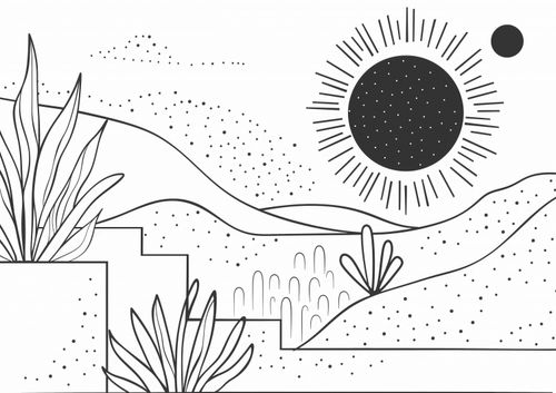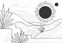 Plakat z serii minimalistyczne zatytułowany Linearny Pejzaż. Plakat przedstawia liniową ilustrację krajobrazu w czerni i bieli, gdzie przestrzeń zapełniają delikatne linie, kropki i abstrakcyjne formy roślinności. Centralnym punktem jest stylizowane słońce z promieniami rozchodzącymi się we wszystkie strony, towarzyszy mu mniejsze ciało niebieskie, które może symbolizować planetę lub księżyc. Lekkie kropki sugerują obecność piasku lub gwiazd, dodając elementu fantazji. Ten plakat wprowadzi do każdej przestrzeni element spokoju i prostoty. Idealnie nadaje się do nowoczesnych przestrzeni, takich jak minimalistyczne biura, jadalnie czy pokoje młodzieżowe, dostarczając neutralnej palety, która pasuje do wielu schematów kolorystycznych i stylów dekoracyjnych.