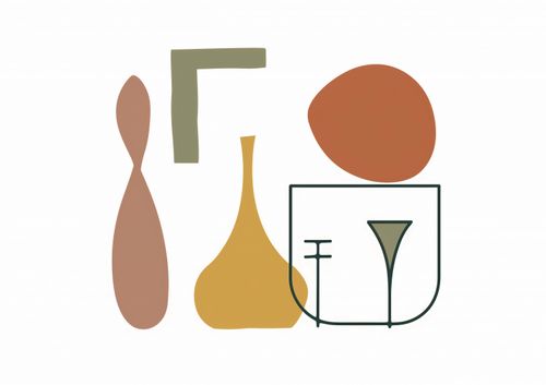 Plakat z serii boho zatytułowany Naczynia. Plakat prezentuje kolekcję abstrakcyjnych form, które przypominają różne przedmioty od naczyń po elementy dekoracyjne, tworząc estetyczną mieszankę linii i kształtów. Zestawienie spokojnych, pastelowych barw z silnymi, geometrycznymi figurami tworzy wizualnie przyjemną kompozycję, która zwraca uwagę swoją subtelną elegancją. To dzieło artystyczne jest doskonałym wyborem dla wnętrz o nowoczesnym designie, w których chcemy wprowadzić sztukę bez dominujących nad przestrzenią. Idealnie sprawdzi się jako delikatny akcent w przestronnym salonie, biurze czy jako część galerii w domowym korytarzu.