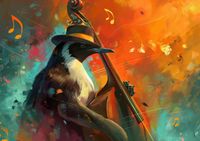 Plakat z serii abstrakcja zatytułowany Pingwinia Nuta. Przedstawia figurę pingwiniego muzyka, elegancko ubranego, grającego na kontrabasie. Ptak nosi klasyczny kapelusz, który dodaje mu artystycznego charakteru, a jego pióra delikatnie przechodzą w struny instrumentu, co tworzy efekt płynnego połączenia muzyki z naturą. Tło plakatu rozświetlone jest ciepłymi, żywymi barwami oraz abstrakcyjnymi kształtami, które przypominają rozsypane nuty i dynamiczny ruch jazzowej melodii. Ten plakat idealnie nada się do wnętrz o muzycznym duszu, takich jak sale koncertowe, studia nagraniowe, jazzowe kluby lub nawet domowe przestrzenie dla miłośników muzyki. Wizualizuje on pasję do muzyki i jej wpływ na otaczającą nas przestrzeń, jednocześnie wprowadzając element wyrafinowanego stylu.