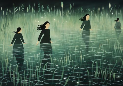Plakat z serii wnętrza zatytułowany Pośród Ciszy, przedstawia grupę postaci kobiecych, poruszających się z gracją przez mglisty, oniryczny krajobraz. Zanurzone po kolana w wodzie, otoczone przez zielone, eteryczne trawy i dyskretnie świecące światła, postacie emanują spokojem i tajemniczością. Styl plakatu, z jego płynnymi liniami i spokojnymi odcieniami zieleni, tworzy uczucie medytacyjnej głębi i harmonii z naturą. Ten plakat idealnie nadaje się do wnętrz, które pragną odzwierciedlić głęboką spokojność i introspekcję, takich jak pokoje medytacyjne, strefy relaksu, domowe biblioteki, a także jako subtelny akcent w przestrzeniach publicznych, gdzie zachęca do chwili wytchnienia i refleksji.