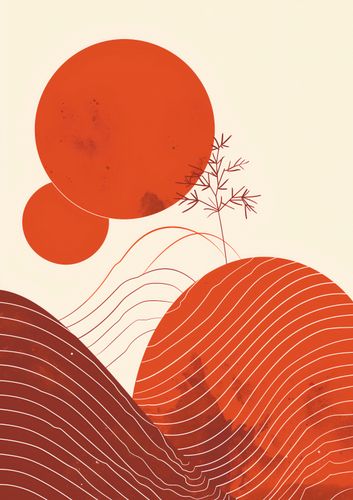 Plakat z serii minimalistyczne zatytułowany Ciepło Czerwieni. Przedstawia on abstrakcyjny krajobraz, w którym dominują okrągłe formy w odcieniach ciepłej czerwieni, nawiązujące do zachodzącego słońca. Delikatna roślina, która wyrasta nad falującymi wzgórzami, wprowadza element natury i spokoju. Warstwowe linie w kształcie fal przedstawiają kształtujący się teren, dodając głębi i ruchu kompozycji. Ten plakat przywodzi na myśl spokój i majestatyczność końca dnia, jest idealny do umieszczenia w przestrzeniach, które celebrują naturalne piękno i proste momenty, takie jak salon, gabinet czy przestrzeń do medytacji.
