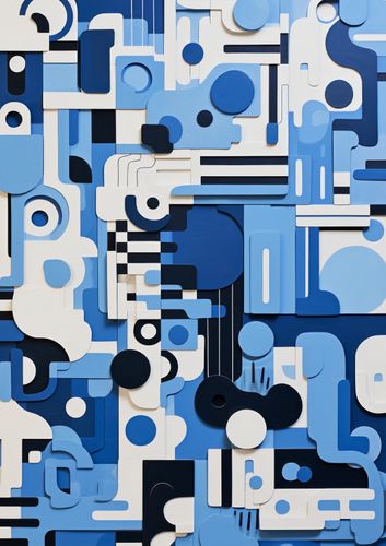 Plakat z serii geometria zatytułowany Niebieski Labirynt. Złożona mozaika geometrycznych kształtów i różnorodnych tekstur w odcieniach niebieskiego i bieli układa się w fascynującą kompozycję przypominającą miasto z lotu ptaka. Kontrasty głębokich granatów z pastelowymi błękitami oraz gładkimi i wypukłymi powierzchniami dodają głębi i trójwymiarowości temu dziełu. Świetnie sprawdzi się w nowoczesnych biurach, przestrzeniach designerskich oraz galeriach sztuki współczesnej.