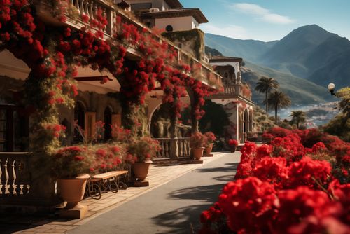 Plakat z serii pejzaże zatytułowany Czerwona Idylla, przedstawia romantyczną scenę otuloną w bujne, kwitnące bougainvillea, które zdobią klasyczną architekturę z widokiem na malownicze wzgórza. Czerwone kwiaty przypominające klejnoty, kontrastujące z ciepłą paletą pastelowych ścian i żywej zieleni, przywołują uczucie wiecznego lata. To arcydzieło znakomicie komponowałoby się w przestronnych, jasnych przestrzeniach, takich jak rezydencje w stylu śródziemnomorskim, ekskluzywne spa czy jako element wyróżniający w eleganckich restauracjach, zapraszając do marzeń o długich, leniwych dniach nad Morzem Śródziemnym.
