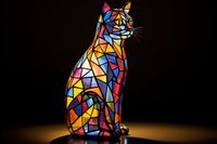 Plakat z serii abstrakcja zatytułowany Koci Witraż. Ten plakat przedstawia artystyczną ilustrację kota, który jest stylizowany na witraż. Zwierzę jest zbudowane z wielu kolorowych, geometrycznych kształtów, które przypominają szklane fragmenty witraża. Barwy są żywe i różnorodne, z przewagą odcieni niebieskiego, czerwonego, żółtego i pomarańczowego, tworząc wizualną ucztę, która zarówno przykuwa uwagę, jak i przyjemnie dla oka. Kot jest przedstawiony w profilu, siedząc z eleganckim, dostojnym położeniem, co dodaje ilustracji majestatycznego charakteru. Tło jest proste i ciemne, co pozwala na to, aby kolory kota były jeszcze bardziej wyraziste. Ta praca może być interpretowana jako hołd dla klasycznej formy sztuki, jaką jest witraż, połączony z nowoczesną grafiką cyfrową, tworząc unikalne i współczesne dzieło sztuki.