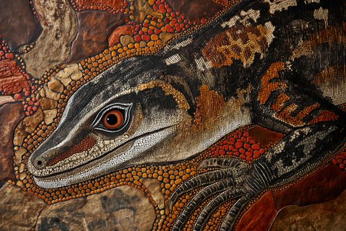Plakat z serii abstrakcja zatytułowany Oko Jaszczurki. Fascynujące dzieło sztuki przedstawia zbliżenie na oko jaszczurki, które jest wykonane z niezwykłą dbałością o detale. Bogata faktura skóry zwierzęcia oraz użycie techniki przypominającej pointylizm sprawiają, że plakat zyskuje trójwymiarową głębię i realizm. Dynamiczna paleta barw, od głębokich odcieni brązu po złote i pomarańczowe akcenty, podkreśla dziką i pierwotną esencję natury. Plakat ten idealnie wpasuje się w dekoracje wnętrz o tematyce przyrodniczej, jak również stanowić może wyrazisty element w przestrzeniach edukacyjnych, takich jak sale biologiczne czy przyrodnicze, a także jako elegancki akcent w przestrzeniach mieszkalnych dla miłośników natury i dzikiej fauny.