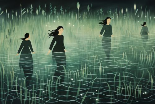 Plakat z serii wnętrza zatytułowany Pośród Ciszy, przedstawia grupę postaci kobiecych, poruszających się z gracją przez mglisty, oniryczny krajobraz. Zanurzone po kolana w wodzie, otoczone przez zielone, eteryczne trawy i dyskretnie świecące światła, postacie emanują spokojem i tajemniczością. Styl plakatu, z jego płynnymi liniami i spokojnymi odcieniami zieleni, tworzy uczucie medytacyjnej głębi i harmonii z naturą. Ten plakat idealnie nadaje się do wnętrz, które pragną odzwierciedlić głęboką spokojność i introspekcję, takich jak pokoje medytacyjne, strefy relaksu, domowe biblioteki, a także jako subtelny akcent w przestrzeniach publicznych, gdzie zachęca do chwili wytchnienia i refleksji.
