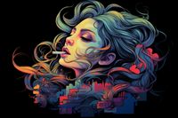 Plakat z serii pop art zatytułowany Sny o Samej Sobie. Ta intensywnie kolorowa ilustracja przedstawia profil młodej kobiety z zamkniętymi oczami, wdychającej życie miasta. Jej włosy i wydychany dym przenikają się, tworząc hipnotyzujące wzory, które płynnie przechodzą w sylwetki miejskiej panoramy. Paleta barw łączy głębokie granaty, żywe pomarańcze i delikatne pastele, co nadaje dziełu zarówno dynamikę, jak i eteryczną jakość. Plakat idealnie oddaje związek między osobistymi doświadczeniami a pulsującym życiem metropolii, co sprawia, że będzie on wyjątkowym dodatkiem do nowoczesnych, miejskich wnętrz, studiów artystycznych, czy loftów.