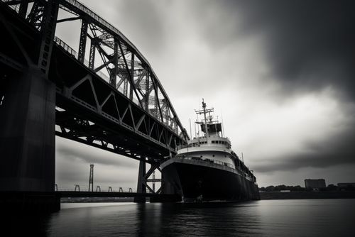 Plakat z serii pejzaże zatytułowany Statek przy Moście. Monochromatyczne przedstawienie statku pod imponującym mostem, gdzie struktury inżynieryjne łączą się z dynamicznym niebem, tworząc kompozycję symbolizującą siłę i postęp. Chłodna paleta barw i silne linie prowadzące oko przez obraz idealnie nadają się do nowoczesnych przestrzeni biurowych lub urbanistycznych salonów. Plakat ten przyciąga uwagę i inspiruje, odzwierciedlając majestat i piękno konstrukcji stworzonych przez człowieka.