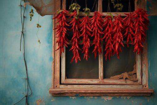 Plakat z serii wnętrza zatytułowany Szczypta Chilli - malowniczy obraz pełen kulturowego bogactwa, przedstawiający bujne kiście czerwonych papryczek chili, suszące się na drewnianej ramie okna. Kontrastujące kolory - żywe czerwienie chili na tle pastelowo-niebieskiej ściany - przyciągają wzrok i oddają esencję wiejskiego życia. Przytulne okno i zardzewiała siatka nadają scenie autentyczny, wiejski charakter, a delikatne odcienie i tekstury ściany dodają głębi i ciepła. Plakat ten jest hołdem dla prostoty i naturalnego piękna codziennego życia, idealnym do wnętrz, które pragną wnieść element tradycyjnego rzemiosła i natury.