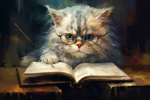 Plakat z serii abstrakcja zatytułowany Ucz Się Ucz. Plakat prezentuje uroczego, puszystego kota rasy perskiej, który z zadumą spogląda przez okulary w stylu vintage, przypominające okulary profesora. Kot wydaje się być zanurzony w lekturze otwartej książki, której strony delikatnie dotyka łapą. Całość jest utrzymana w ciepłej, złotej kolorystyce, co nadaje scenie przytulny, kameralny nastrój. Plakat ma charakter impresjonistyczny, z widocznymi pociągnięciami pędzla, które dodają dynamizmu i tekstury. Ten plakat idealnie wpasowałby się w atmosferę bibliotek, zakątków do czytania, a nawet jako dekoracja w salonach lub gabinetach, dodając wnętrzu intelektualnego charakteru i ciepła.