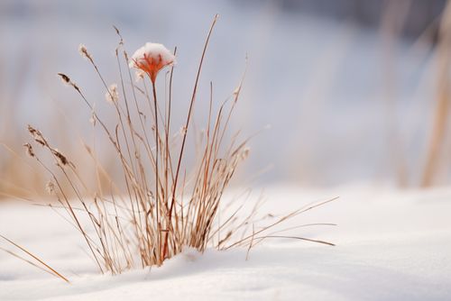 Plakat z serii natura, zatytułowany Zima w Detalach. Delikatna kompozycja przedstawiająca trawę i pojedynczy kwiat, które przebijają się przez śnieg, uchwycone w subtelnych, ciepłych tonach o poranku. Subtelne odcienie i miękkość światła nadają temu obrazowi uczucie spokoju i ciszy zimowego krajobrazu. Idealny do wnętrz, które cenią sobie subtelność i naturalność, wnosząc elementy świeżości i czystości zimowego poranka. Doskonale sprawdzi się w salonach, sypialniach, czy przestrzeniach wspólnych, oferując wyciszający efekt wizualny.