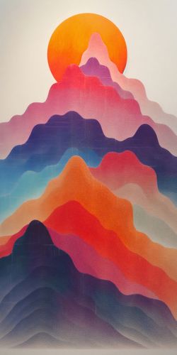 Plakat z serii abstrakcja zatytułowany Gama Gór to stylizowane przedstawienie majestatycznych gór, które tworzą warstwowe pasmo kolorów od głębokiego fioletu poprzez róż, czerwień, aż po ciepłe odcienie pomarańczu i żółci. Ta abstrakcyjna interpretacja krajobrazu górskiego z dużym, słońcem w odcieniach intensywnego pomarańcza w tle, nadaje dziełu atmosferę spokoju i medytacyjnej głębi. Delikatne tekstury i przejścia tonalne między warstwami nadają ilustracji poczucie trójwymiarowości i dynamiki. Plakat idealnie komponuje się z przestrzeniami, które cenią sobie naturę i spokój, nadając wnętrzom charakteru i głębi, doskonały do salonów, przestrzeni wellness, pokojów medytacyjnych lub jako akcent w nowoczesnych biurach.