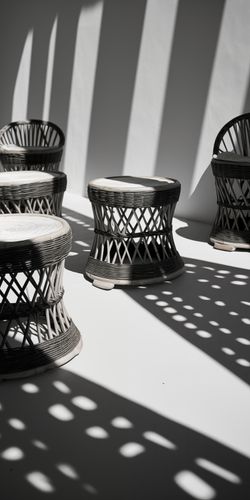 Plakat z serii wnętrza zatytułowany Gra Świateł to stylowa, monochromatyczna fotografia, która oddaje estetykę współczesnego designu. Na fotografii widzimy zestaw eleganckich, plecionych stołków z rattanu ustawionych na tle geometrycznych cieni. Ostre linie cieni przełamują okrągłe kształty mebli, tworząc fascynującą kompozycję pełną kontrastów. Białe siedziska stołków pięknie kontrastują z ciemniejszymi elementami, a gra światła i cienia nadaje scenie trójwymiarowość i teksturę. Plakat ten będzie doskonały dla miłośników minimalistycznych wnętrz, a także dla osób poszukujących elementu dekoracyjnego, który wprowadzi do pomieszczenia nowoczesny i artystyczny akcent. Idealny do nowoczesnych przestrzeni mieszkalnych, biur, kawiarni lub galerii sztuki.