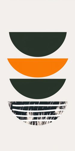Plakat z serii boho zatytułowany Gra Tekstur to połączenie czystych, geometrycznych form z wyrazistą grą tekstur. Trzy półkoliste kształty w odcieniach głębokiej zieleni i żywej pomarańczy są ułożone w precyzyjny stos, tworząc zaskakującą głębię i zmysłową symetrię. Najniższa forma przerywa ten porządek, wprowadzając do dzieła dynamiczne, surowe detale, przypominające efekt artystycznego, spontanicznego malowania lub drapowania. Ten plakat jest idealnym wyborem dla wnętrz, które doceniają silne, graficzne elementy oraz surowy, industrialny klimat, pasując zarówno do minimalistycznych, jak i bardziej eklektycznych przestrzeni.