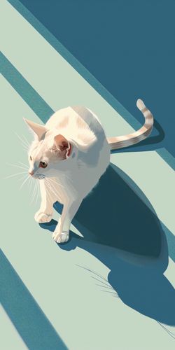 Plakat z serii wnętrza zatytułowany Kocia Persona przedstawia białego kota o intensywnie błękitnych oczach, który z gracją przemierza przestrzeń ożywioną grą cieni. Jego postawa jest skupiona i zwinna, a cień rzucony na pastelowoniebieskie tło tworzy silny wizualny kontrast, podkreślając dynamikę ruchu. Ostre linie na podłożu dodają głębi kompozycji, jednocześnie zachowując minimalistyczny charakter dzieła. Ten plakat będzie idealnym dodatkiem do nowoczesnych, jasnych wnętrz, które cenią sobie prostotę i elegancję, na przykład jako element dekoracyjny w salonie, sypialni lub przestrzeni biurowej, gdzie może dodać subtelności i lekkości.