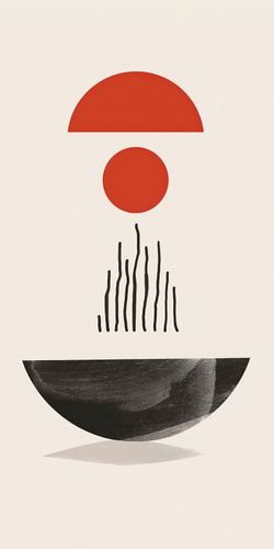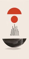 Plakat z serii boho zatytułowany Półokrągła Forma.Na tej grafike zmysłowe, geometryczne kształty tworzą obraz, który równie dobrze może być interpretacją wschodu słońca, jak i abstrakcyjnym przedstawieniem równowagi w przyrodzie. Półokrągła, czerwona forma nad czarną, pionową linią może sugerować słońce wschodzące nad cichym jeziorem, a czerwony krąg pośrodku może być metaforą istoty życia. Duża, ciemna forma na dole to ziemia lub możliwe odbicie, a całość kreuje uczucie pełni i harmonii.Plakat wprowadzi do wnętrza poczucie spokoju i wyważenia. Jest idealny dla tych, którzy chcą dodać do swojej przestrzeni element medytacyjny, pobudzający do refleksji. Doskonale pasuje do minimalistycznych salonów, biur, a także jako element zen w sypialniach, wprowadzając atmosferę oczyszczenia i wewnętrznej równowagi.