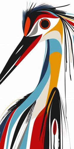 Plakat z serii abstrakcja zatytułowany Portret to abstrakcyjne przedstawienie bociana, w stylu modernistycznej grafiki. Ptak jest przedstawiony przy użyciu odważnych, czystych linii i jasnych, kontrastujących barw, które łączą się w dynamiczną i nowoczesną kompozycję. Linie tworzą zarys ptaka, a kolorowe płaszczyzny - od czerwieni, poprzez błękity, aż po odcienie żółci i czerni - nadają głębi i charakteru jego postaci. Akcenty kolorystyczne, jak czerwone pióro czy niebieski akcent na szyi, dodają dziełu energii i wyrazistości. Plakat jest żywy i pełen charakteru, idealny do wnętrz, które szukają silnego wizualnego akcentu, takich jak współczesne salony, galerie sztuki, czy przestrzenie kreatywne.