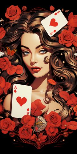 Plakat z serii abstrakcja zatytułowany Różany Hazard. Ta bogato zdobiona grafika przedstawia portret kobiety z królewskim spokojem, otoczoną przez wirujące karty z sercami i rozkwitające czerwone róże. Jej włosy płynnie przechodzą w kwiatowe motywy, a spojrzenie jest pełne tajemnicy i uroku. Motyle i drobne perełki dodają kompozycji element fantazji i delikatności. Wszystko to na tle głębokiej czerni, która eksponuje intensywność kolorów i detali. Plakat ten jest idealny dla przestrzeni, które chcą dodać element romantyzmu i wyrafinowania, jak eleganckie sypialnie, prywatne kolekcje czy luksusowe salony. Jego barwna paleta i symboliczne elementy sprawiają, że jest to dzieło, które przyciąga wzrok i pobudza wyobraźnię.