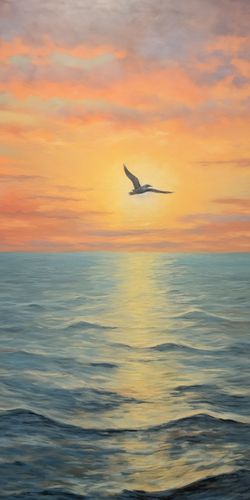 Plakat z serii pejzaże zatytułowany Serenada Nieba. Ten olśniewający plakat przedstawia moment, gdy ostatnie promienie dnia malują niebo w odcienie pomarańczy i różu, a pojedynczy ptak szybuje w stronę zachodzącego słońca. Morze rozciąga się aż po horyzont, odbijając złote światło, które nadaje scenie poczucie nieskończoności i spokoju. Doskonale nadaje się do wnętrz, które aspirują do stworzenia atmosfery spokoju i refleksji, takich jak salony, pokoje wypoczynkowe, czy przestrzenie wellness i spa.