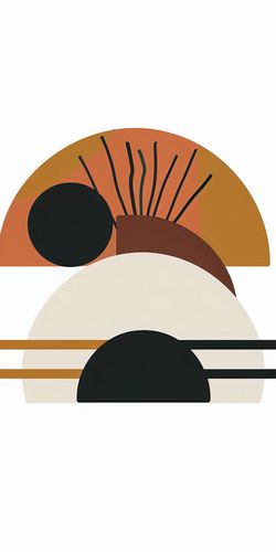 Plakat z serii boho zatytułowany Słońce i Cień. Plakat przedstawia zestawienie półkoli i geometrycznych kształtów, które razem tworzą interpretację astronomicznego zjawiska. Na górze mamy półkoło w ciepłych odcieniach pomarańczu z czarnym dyskiem, które przywodzi na myśl słońce częściowo zakryte przez księżyc podczas zaćmienia. W centrum dominuje większe półkoło w kolorze kości słoniowej, stanowiące tło dla pozostałych elementów. Przez środek obrazu przebiegają równoległe linie, które mogą symbolizować równonoc lub zmianę pór roku. Całość kompozycji wydaje się balansować na granicy światła i cienia, tworząc estetycznie przyciągający i spokojny obraz. Doskonale odnajdzie się na ścianach w nowoczesnych przestrzeniach życiowych, biurach z konceptem open space, a także jako ozdoba w holach i poczekalniach, gdzie geometryczne formy mogą stać się punktem skupienia i medytacji.