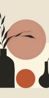 Plakat z serii boho zatytułowany Stół Roślin. Plakat przedstawia stilizowaną kompozycję abstrakcyjnych form, które mogą przypominać wazony z roślinami. Czarny, silnie zarysowany wazon po lewej stronie kontrastuje z bardziej płynnymi kształtami i ciepłymi odcieniami czerwieni i beżu, tworząc zrównoważoną, ale dynamiczną scenę. Rośliny są zredukowane do najprostszych form, co nadaje im elegancki, graficzny charakter. Prostota linii i ograniczenie detali podkreślają minimalistyczny charakter pracy. Świetnie sprawdzi się jako dekoracja w nowoczesnych, minimalistycznych przestrzeniach, gdzie może służyć jako subtelny, ale wyraźny akcent. Idealnie nadaje się do umieszczenia w salonie, sypialni lub biurze, oferując spokojny motyw przyrody w abstrakcyjnej formie, który może inspirować do refleksji i kreatywności.