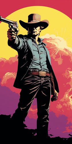 Plakat z serii pop art zatytułowany Strzelec z Epoki. Ten plakat przedstawia postać klasycznego kowboja w akcie wystrzału, z tłem wschodzącego słońca, które rozświetla scenę w ciepłych odcieniach czerwieni i pomarańczy. Silny kontrast i zdecydowane linie wydobywają charakterystyczne cechy postaci, od kapelusza po detale na szelkach i pasie. Plakat ten jest hołdem dla kultury westernów i bezkresnych amerykańskich przestrzeni, idealny dla miłośników historii i kinematografii, a także jako wyrazisty element dekoracyjny w miejscach takich jak domy, bary tematyczne lub sale kinowe.