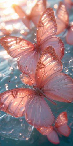 Plakat z serii natura zatytułowany Świetliste Motyle. Na plakacie widzimy delikatne motyle o przezroczystych, różowych skrzydłach, unoszące się nad wodą i łagodnie odbijające światło słoneczne. Kropelki wody na ich skrzydłach dodają uczucia świeżości i czystości. Plakat emanuje spokojem i pięknem, idealnie nadając się do przestrzeni, które chcą wprowadzić element relaksu i spokoju, takich jak spa, pokoje medytacyjne, a także jako łagodny element dekoracyjny do domu.