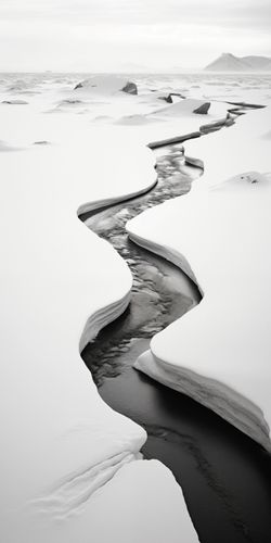Plakat z kolekcji pejzaże zatytułowany Meandry Mrozu. Ten plakat przedstawia sinący lodowiec, którego szczeliny przecinają śnieżnobiałą powierzchnię, tworząc naturalne dzieło sztuki. Monochromatyczna paleta barw, gdzie biel śniegu kontrastuje z głębokim czerniami wód lodowcowych, przemawia do wyobraźni i wywołuje uczucie surowości oraz majestatu natury. Doskonały do wnętrz o minimalistycznym designie lub jako mocny wizualny akcent w przestrzeniach takich jak salony, biura i lobby hotelowe, gdzie może inspirować do refleksji nad pięknem i siłą przyrody.
