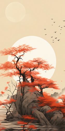 Plakat z serii pejzaże zatytułowany Szepty Wiatru. Niesamowity krajobraz z jaskrawo czerwonymi drzewami rosnącymi na majestatycznej skale, której kształty wydają się być ukształtowane przez wieki. Błyszczący biały księżyc oświetla spokojne wody, które otaczają skale, podczas gdy stado ptaków przenika przez jasne niebo, dodając uczucie przestrzeni i nieskończoności. Subtelne odcienie szarości i biele w tle tworzą kontrast dla wyrazistych czerwieni drzew, nadając scenie głębię i dramatyzm. Idealny do ozdoby salonów medytacyjnych, gabinetów terapeutycznych lub luksusowych hotelowych holów.