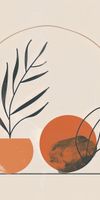 Plakat z serii boho zatytułowany Tonacja Pasteli. Plakat przedstawia harmonijną kompozycję elementów natury i abstrakcyjnych kształtów. Widzimy doniczkę z delikatną rośliną o czarnych, smukłych liściach, które delikatnie kontrastują z ciepłym odcieniem pomarańczy naczynia. Towarzyszą jej geometryczne formy: dwa krągłe kształty w tonacji ziemi, które przeplatają się, tworząc iluzję przestrzeni i głębi. Rysunek uzupełnia subtelna linia horyzontu i rozproszone kropki, dodające plakatowi dynamiki. Idealnie sprawdzi się jako element dekoracyjny w pomieszczeniach, gdzie dominuje spokój i równowaga, takich jak jasne, przestronne salony, pokoje do medytacji lub ciche zakątki bibliotek.
